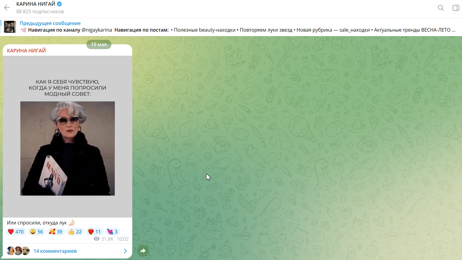 Контент аккаунтов Карины Нигай в Телеграмм и Ютуб идентичен, поэтому анализировать каждый канал не имеет смысла. Расскажем о публикациях на примере телеграмм-канала. На май 2025 года здесь почти 89 000 подписчиков, но охваты в лучшем случае соответствуют статистике только на треть.
