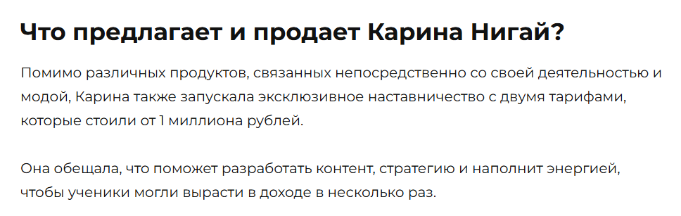 На канале Карины Нигай в Тг и других соцсетях также нет никаких упоминаний об этом стартапе, но записи могли быть и удалены после неуспешного запуска коммерческого предложения. Единственное доказательство существования такого курса – нерабочая вкладка на сайте школы.