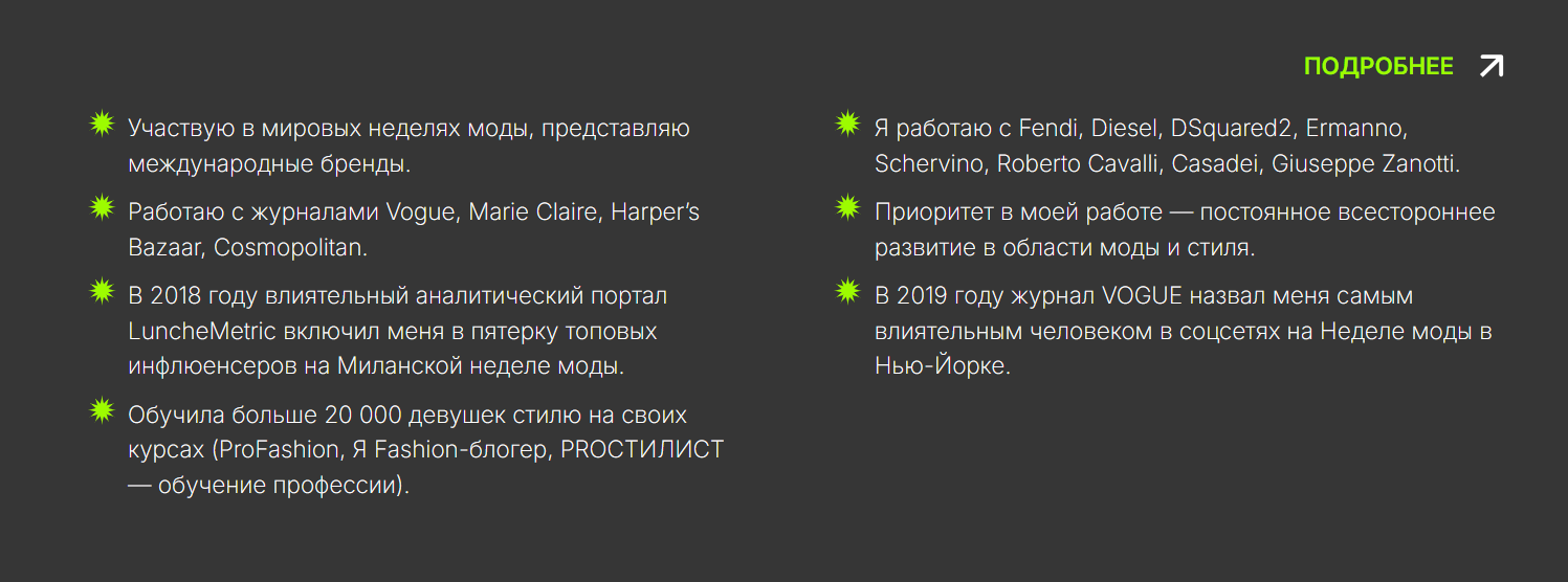 Помимо различных продуктов, связанных непосредственно с деятельностью стилиста, на сайте Карины есть раздел курсами по продвижению, но подробная информация на май 2025 года по неизвестным причинам недоступна.