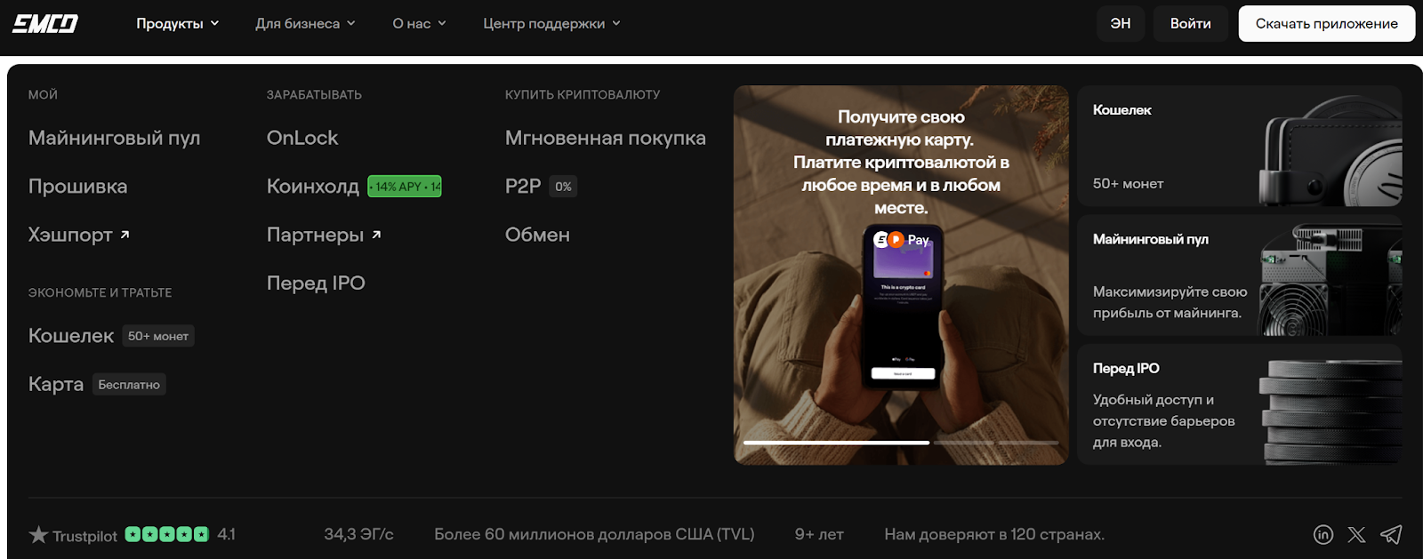 EMCD — платформа с широкими возможностями от майнинга до стейкинга, есть даже P2P обменник и возможность оплаты на маркетплейсах картой EMCD.