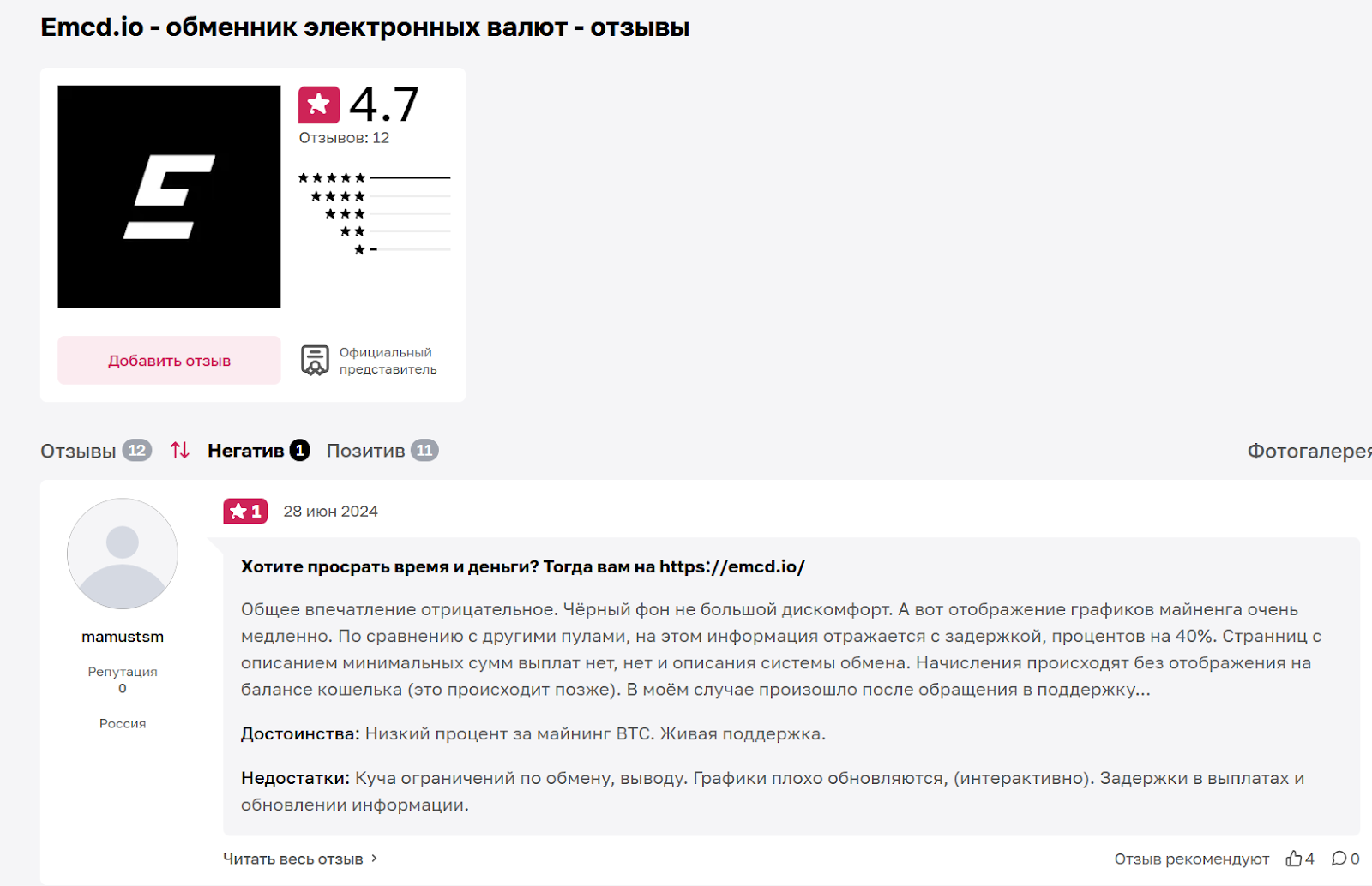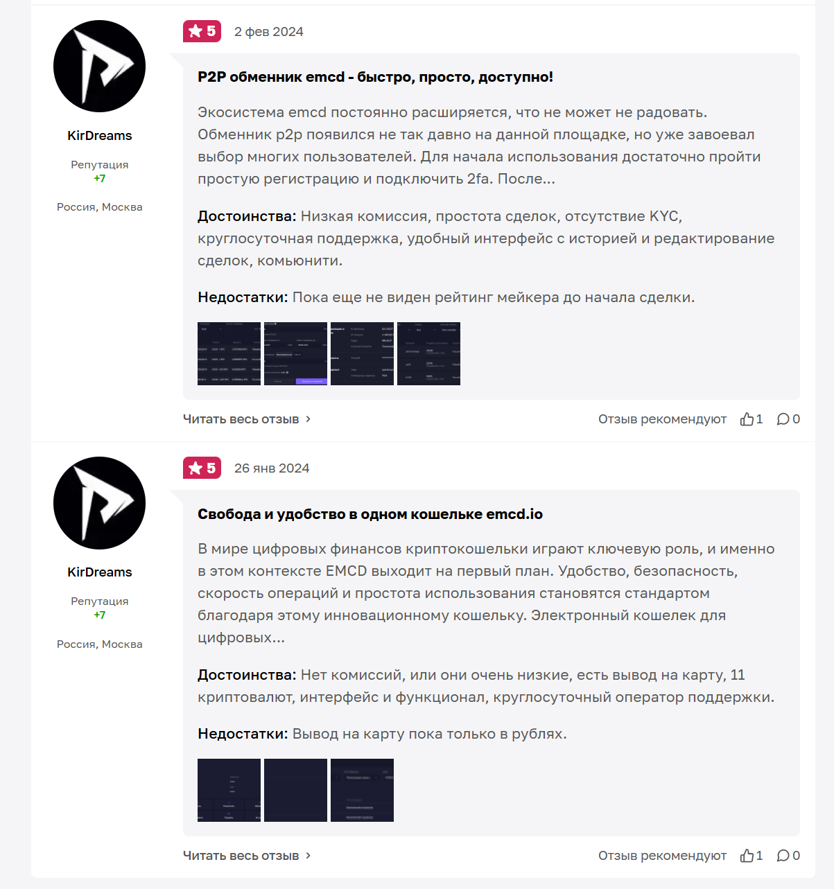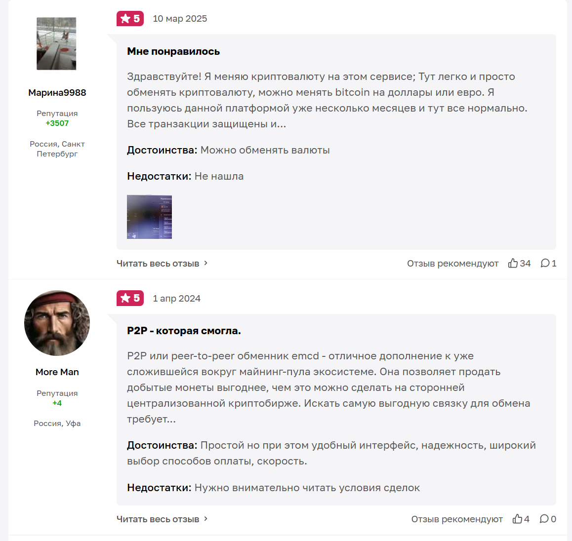 Прямых отзывов о криптокарте EMCD почти нет, но о самой платформе и ее функционале в целом мнение клиентов позитивное. На TrustPilot рейтинг компании составляет 4.1. В русскоязычном сегменте наибольшей популярностью пользуется криптовалютный обменник. Пользователи отмечают быстрые операции, отсутствие комиссий, чат в Телеграмм. Из негативных факторов — мало мерчантов, их рейтинг виден только после открытия сделки.