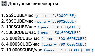 - На майнинге токенов. Чтобы запустить майнинг, потребуется пополнить счет. Самая дешевая виртуальная видеокарта обойдется в 2 500 CUBE или 250 рублей. Она будет приносить по 25 токенов в час.