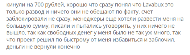 Некоторые клиенты жаловались, что система заблокировала аккаунт без обоснования причин, в итоге деньги так и остались висеть на площадке Lavabux. Пользователи не то что не могли заработать, они и свои вложенные потеряли.