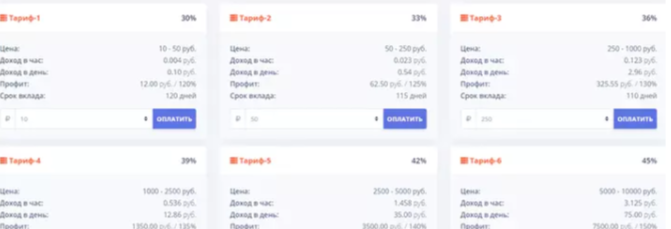 Как мы видим, всего предусмотрено 6 планов, разбег тарифов от 10 рублей до 10 тысяч рублей. Рост доходов прямопропорционален депозиту. При возрастании инвестиций доходы в каждый час увеличиваются в геометрической прогрессии. То есть, если верить предложенным методам, пользователи могут в разы увеличить свои средства. Но статистику своих клиентов руководство компании не демонстрирует, это ставит под сомнению репутацию проекта.