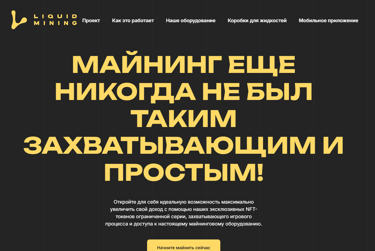 Liquid Mining (Ликвид Майнинг) — платформа, где можно майнить крипту, причем весело, так как разработчики реализовали здесь нехилую геймификацию. Проект прост и удобен для новичка, подойдет для майнера любого уровня. А процесс добычи крипты делается более веселым благодаря уникальным NFT и прямому доступу к майнинговому оборудованию.