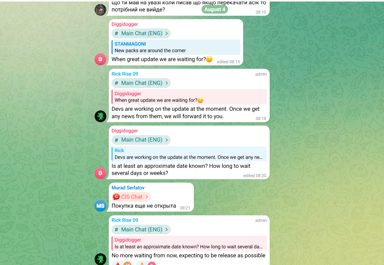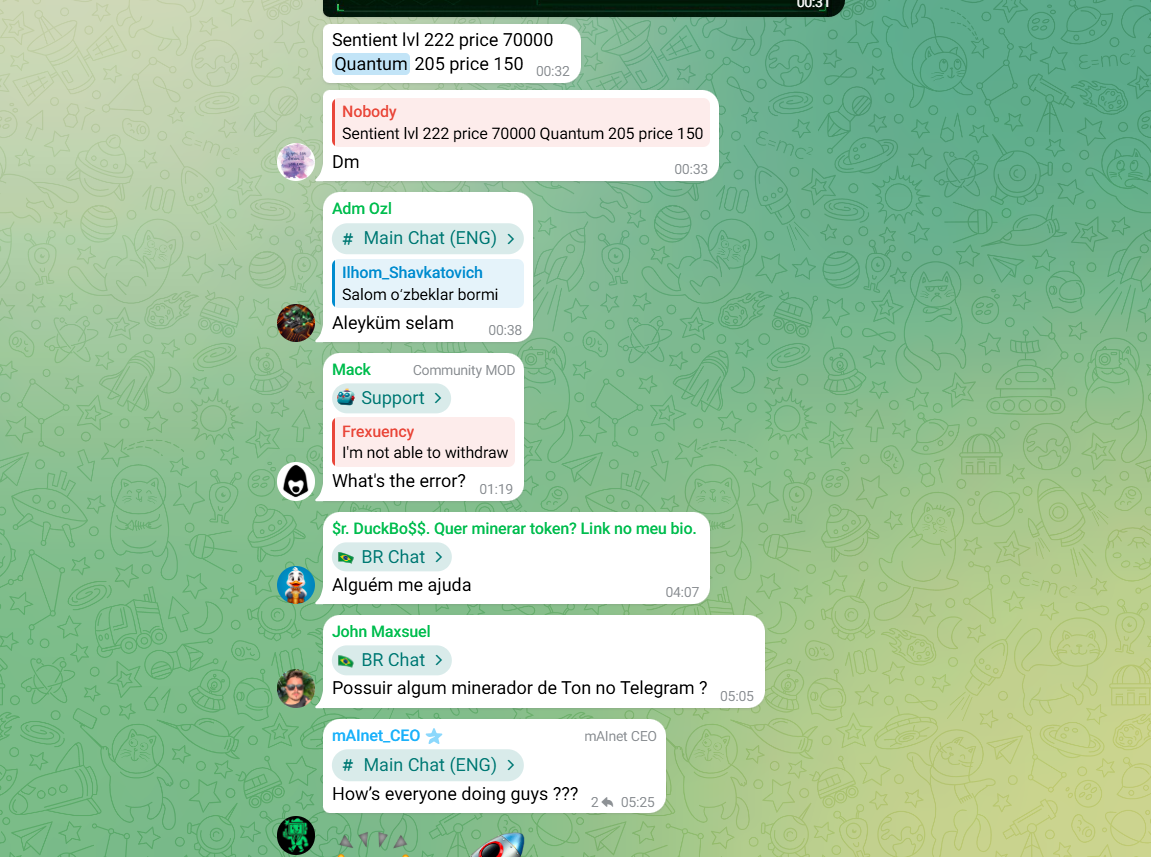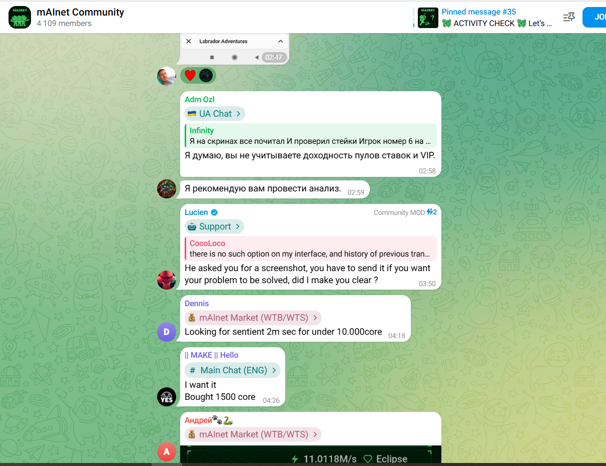 Анонсы новых фишек подогревают интерес проекта Майн бот телеграм и на русском, и на английском. Видно, что он играет на глобальной арене. Кроме того пользователи обсуждают тактики, делятся хитростями, спорят, что выгоднее — гнать ферму в апгрейд или зависнуть в стейкинге.