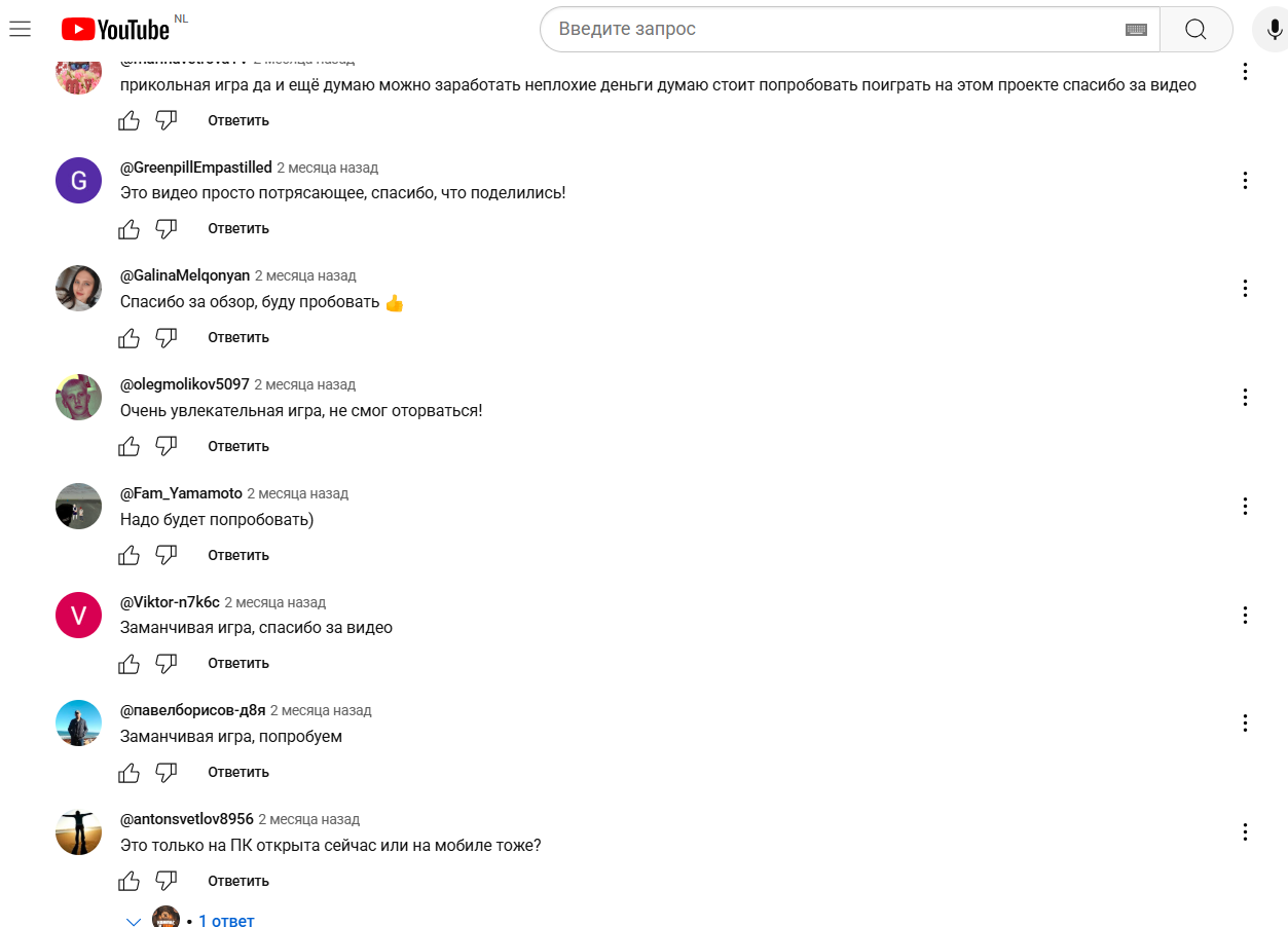 В обзорах игры на YouTube пользователи тоже на позитиве: хвалят проект за увлекательный геймплей, отмечают, что можно заработать неплохие деньги, благодарят авторов за обзор и делятся планами попробовать игру в деле.