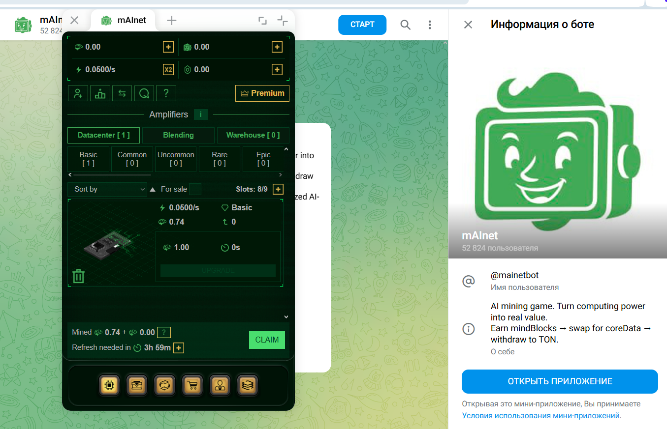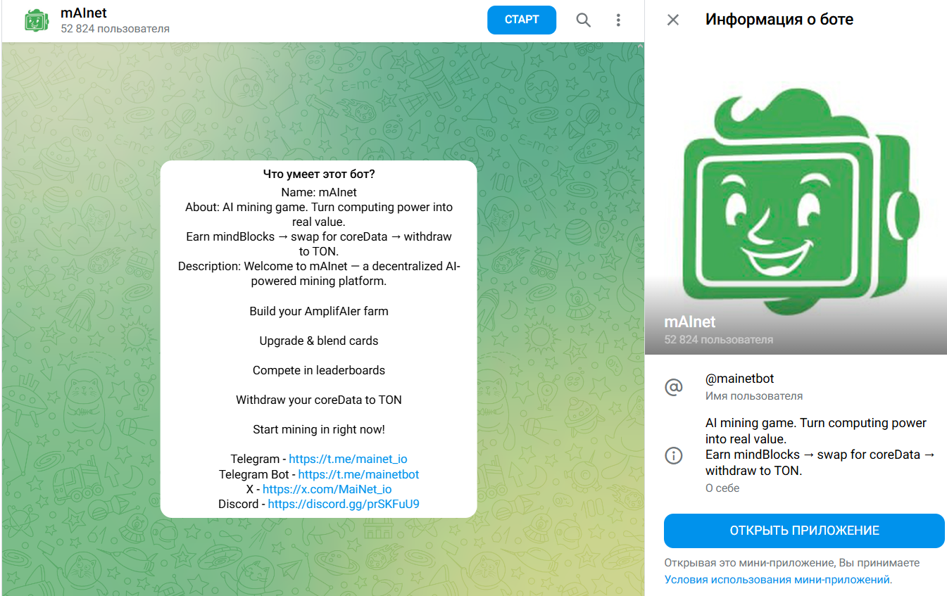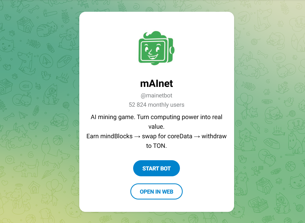 mAInet — это яркая смесь игрового драйва и криптовалютной авантюры, где вам обещают превращение виртуальных ферм в реальные деньги прямо в ТГ.