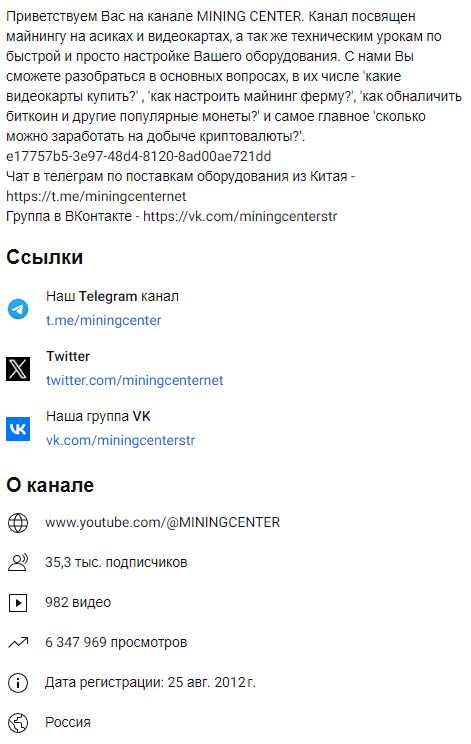 На Youtube у автора не задалось. За 12 лет существования канала он набрал только 35 тысяч подписчиков. Среднее число просмотров на ролике — 4 тысячи. Какие-то хайповые темы набирают до 10 тысяч. В медиа автор точно не состоялся, хотя у него неплохая подача и качество роликов.Отдельного внимания заслуживает чат майнинг центра. Там периодически проводят розыгрыши для подписчиков. Это еще один способ привлечения подписчиков. Один из самых низкокачественных. Розыгрыши используют, чтобы мелькать в медиа или перевести подписчиков из одного места в другое. За 12 лет публичной деятельности автор не научился собирать аудиторию.
