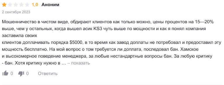 Чуть не вляпался называется. Написал менеджеру по поводу оборудования и цены, а меня в довольно грубой форме послали в канал искать цены, типа на сайте они другие. Уже бред. Полез дальше изучать инфу, наткнулся на несколько негативных отзывов и стало все понятно про них. Спасибо менеджеру, что дал повод их проверить…