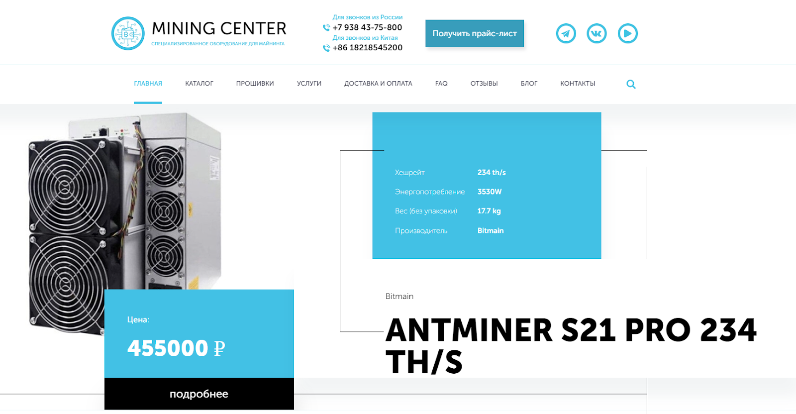 Официальный сайт компании — mining-center.net. Это очередной интернет-магазин, сделанный на коленке. Дизайн либо делали вручную на конструкторе, либо заказывали самый дешевый вариант. Часть блоков съезжает, текст в половине случаев нечитаемый.