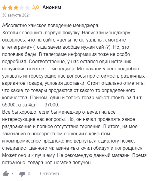 Отзывы говорят сами за себя. Люди недовольны сотрудничеством. Большинство не рекомендует этот интернет-магазин.