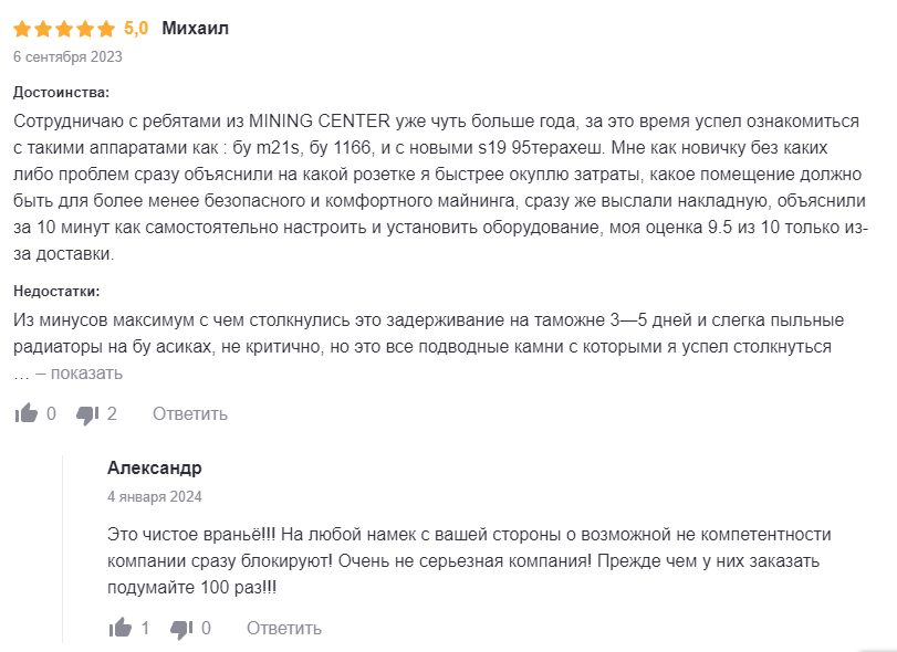 Если вы сотрудничали с компанией Майнинг Центр, напишите об этом в комментариях. Расскажите, насколько выгодными оказались цены, довезли ли вам оборудование в целости и какие общие впечатления остались от этой организации.