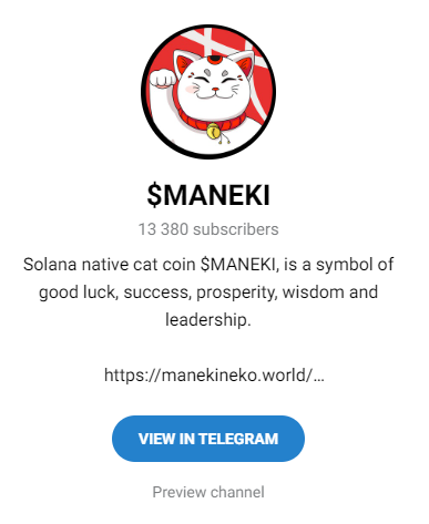 Сообщество крипты Манеки есть в Телеграме, там 17 900 подписчиков. В основном там публикуется актуальная стоимость монетки, а также приглашение участников паблика присоединиться к каналу криптовалюты в Х. У монеты есть сайт Maneki Official. Там есть несколько графических элементов, которые символизируют Maneki, описана токономика.