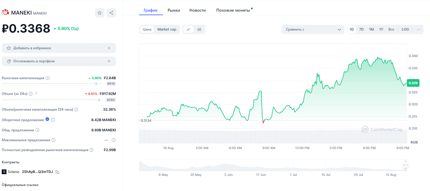 На момент проведения нашей проверки 18 августа 2024 года стоимость Maneki составляет $0.003778. За последние 24 часа объем торгов достиг $10,392,415. Технические характеристики токена Maneki следующие: