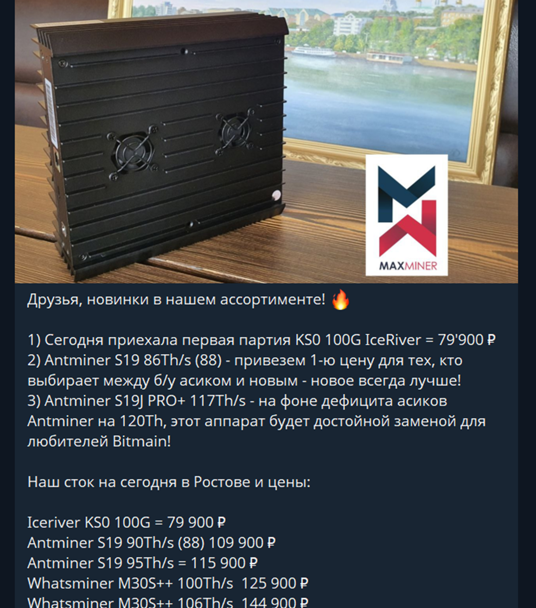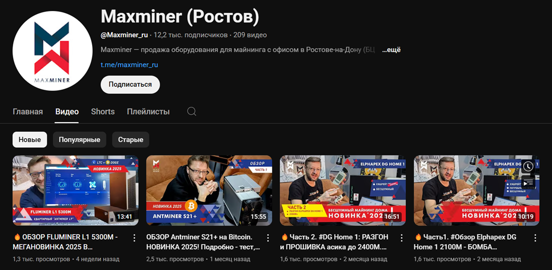 Компания «Максмайнер» предлагает на своем канале новости рынка криптовалют, а также актуальную информацию о майнинге. Основным направлением работы является продажа оборудования для добычи криптовалюты. На данном канале можно узнать актуальную стоимость интересующей технике в Ростове и Москве. Специалисты компании обещают качественные услуги хостинга, проводят примерные расчеты окупаемости и могут помочь с выбором подходящего варианта.