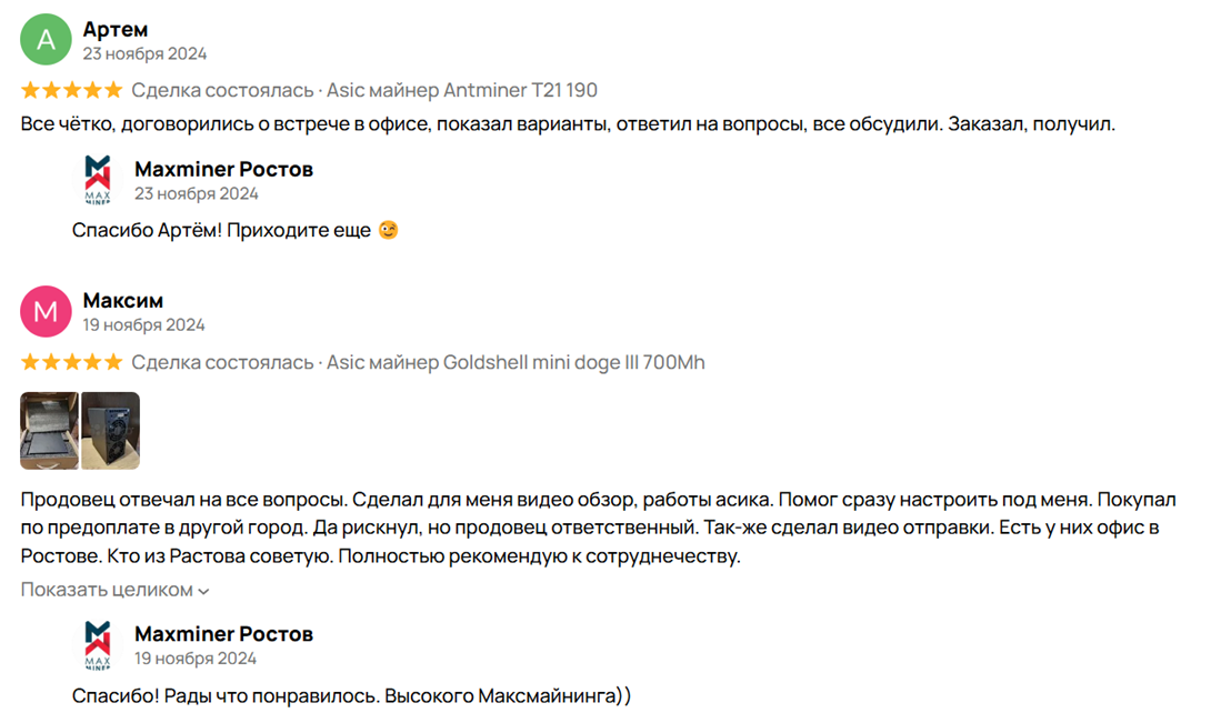 В сети встречают преимущественно позитивные отзывы о Maxminer. Если смотреть по продажам на Avito, то там у продавца очень высокий рейтинг. Аккаунт имеет более 60 продаж и не получил ни одного отзыва ниже пяти звезд. Также в других источниках можно встретить отклики людей о том, что они довольны сделкой. В комментариях в социальных сетях люди не высказываются негативно и не обвиняют компанию в обмане.