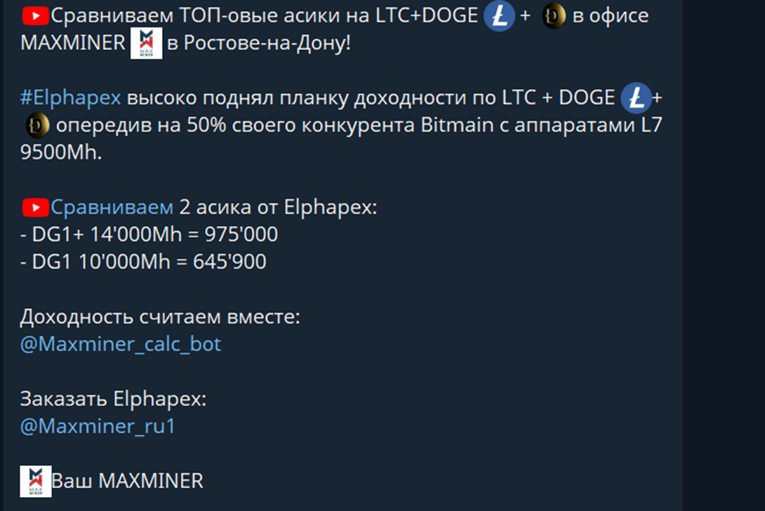 Большая часть контента в телеграм-канале Maxminer ru состоит из рекламы оборудования для майнинга. Владельцы площадки указывают характеристики техники, ее особенности, цену продажи в разных регионах. Помимо этого, автор создает много видео контента. Это касается как записей для телеграм-канала, так и полноценных роликов для ютуб-канала. Для пользователей создан калькулятор дохода и другие дополнительные инструменты.