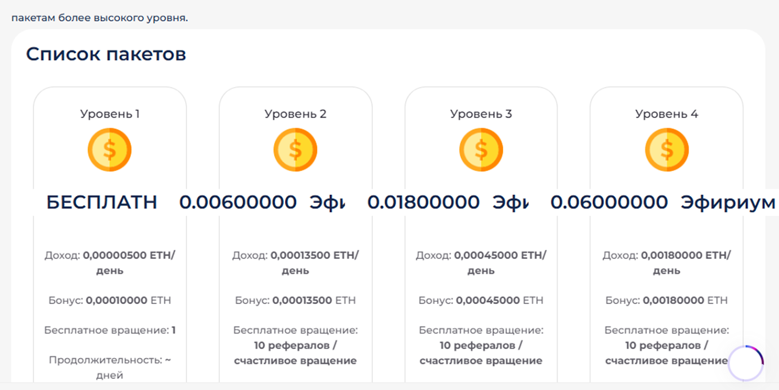 - 4-й уровень стоит 0,06 Eth, прибыль составит 0,0018 Eth на два месяца.