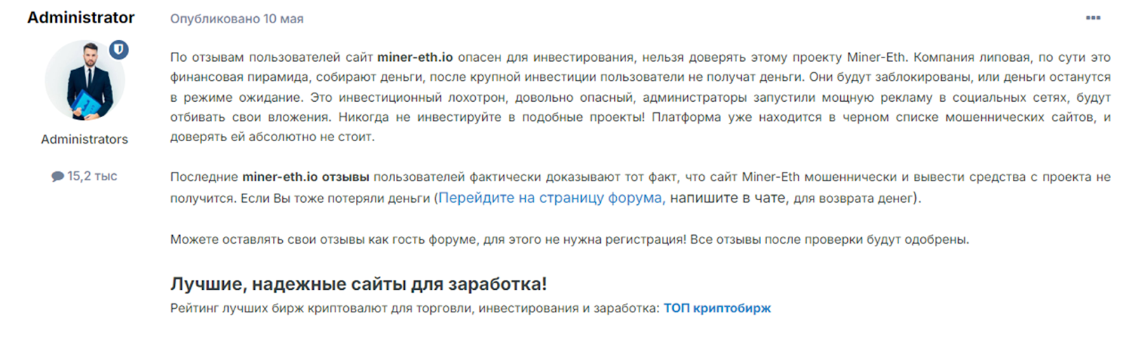 Мы категорически не рекомендуем вкладывать деньги в Miner eth. Компания не предоставляет ни документов, ни фактических гарантий получения денег, отзывы на форумах негативные. Вероятность, что перед нами банальная пирамида, огромна.