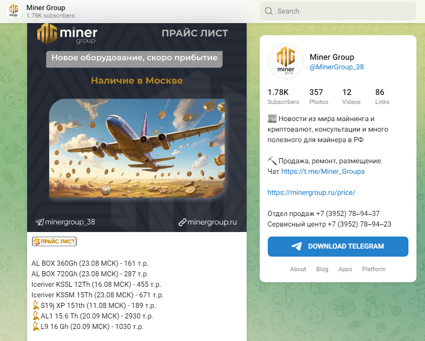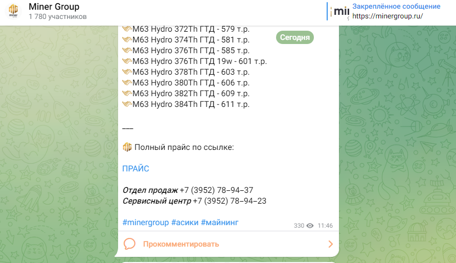 Авторы канала на постоянной основе заливают информацию о новом оборудовании, а также не забывают упомянуть и прайс. После описания товара внизу поста всегда можно увидеть ссылку, которая ведет на основной сайт компании Miner Groupa.