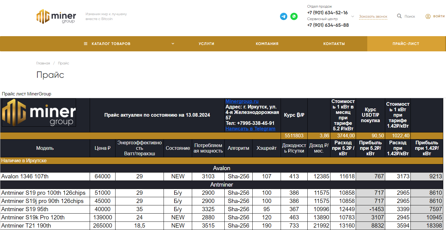 Также стоит отметить, что никакой информации об образовании, лицензии персонала нет даже на сайте компании. Простыми словами, клиенты, которые поверят на слово мошенникам из MinerGroup 38, в дар отдадут свои средства. А стоит каждое оборудование недешево. Если пролистать телеграм-канал, можно увидеть прайс на каждый товар.