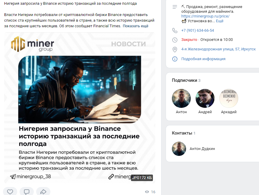 Хотя авторы проекта minergroup.ru и стараются поддерживать активность в телеграм, в социальной сети в ВК у них это получается не очень эффективно. Последняя запись в сообществе была сделана в марте 2024 года.