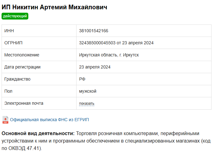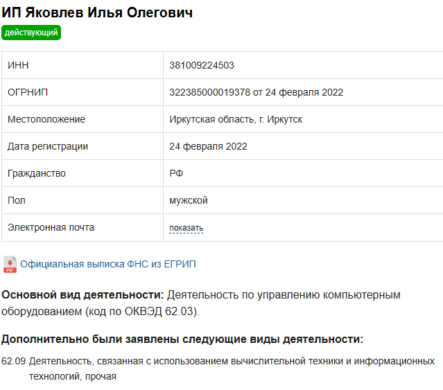 В подвале сайта есть имена предпринимателей, которые владеют компанией. Первый — ИП Яковлев Илья Олегович, ИНН: 381009224503, второй — ИП Никитин Артемий Михайлович, ИНН: 381001542166.