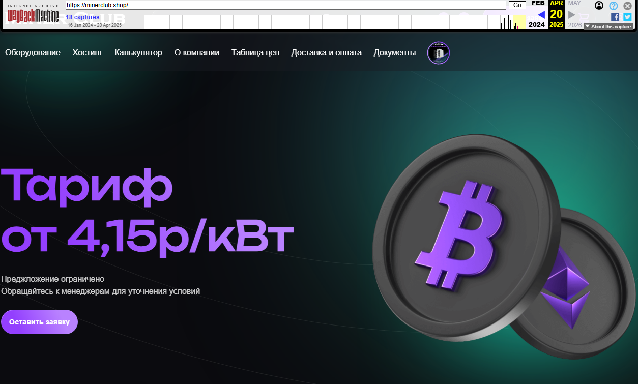 Ранее у проекта был сайт minerclub shop. Домен зарегистрирован в 2021 году… Сейчас он недоступен. Судя по данным из Веб-архива, последний раз сайт был доступен в апреле 2025 года.
