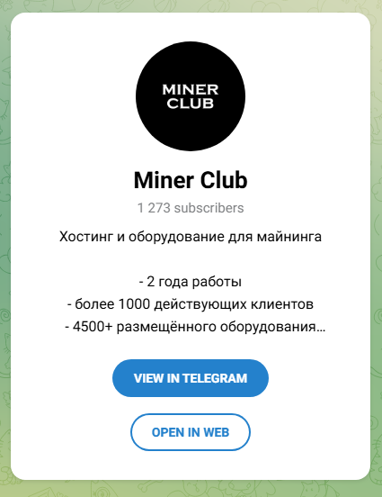 В описании канала указано, что компания предлагает хостинг и оборудование для майнинга. Имеет опыт более 4 лет, сотрудничает с 2 тысячами клиентов и разместила более 414+ тысяч единиц оборудования.Хостинг от Miner club shop