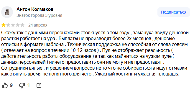 - Реальные отзывы — в Яндекс.Картах полно жалоб на: внезапные отключения оборудования, проблемы с выплатами, грубое нарушение договоров.