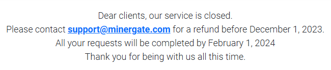 Судя по архивным версиям сайта, МайнерГейт официально закрылся еще в 2023 году. В это время вместо привычного интерфейса платформы появлялось объявление о возвратах и прекращении поддержки после февраля 2024 года.