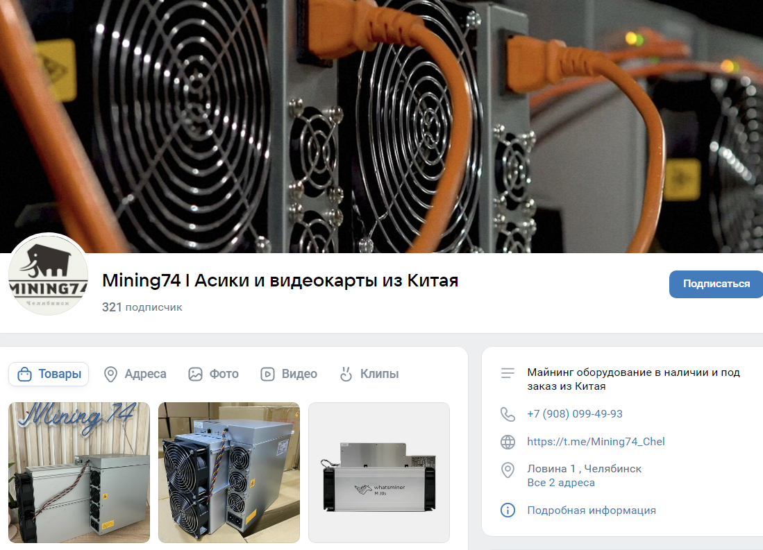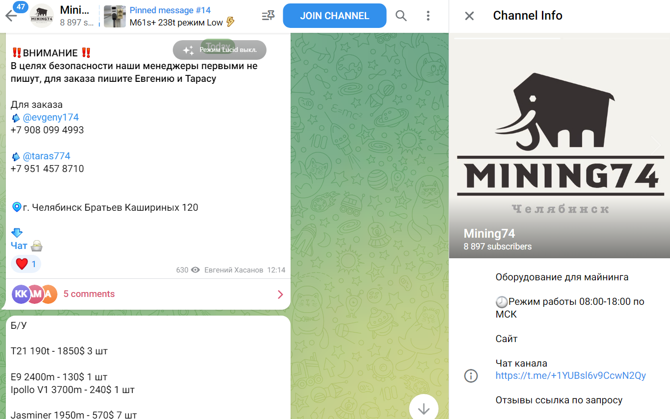 В тгк размещены фото и описание актуального оборудования. Также представлены некоторые новости в области цифровых валют. В описании сообщества оставлен тг-аккаунт основателя Евгения Evgeny174, а также менеджера Тараса Taras774.