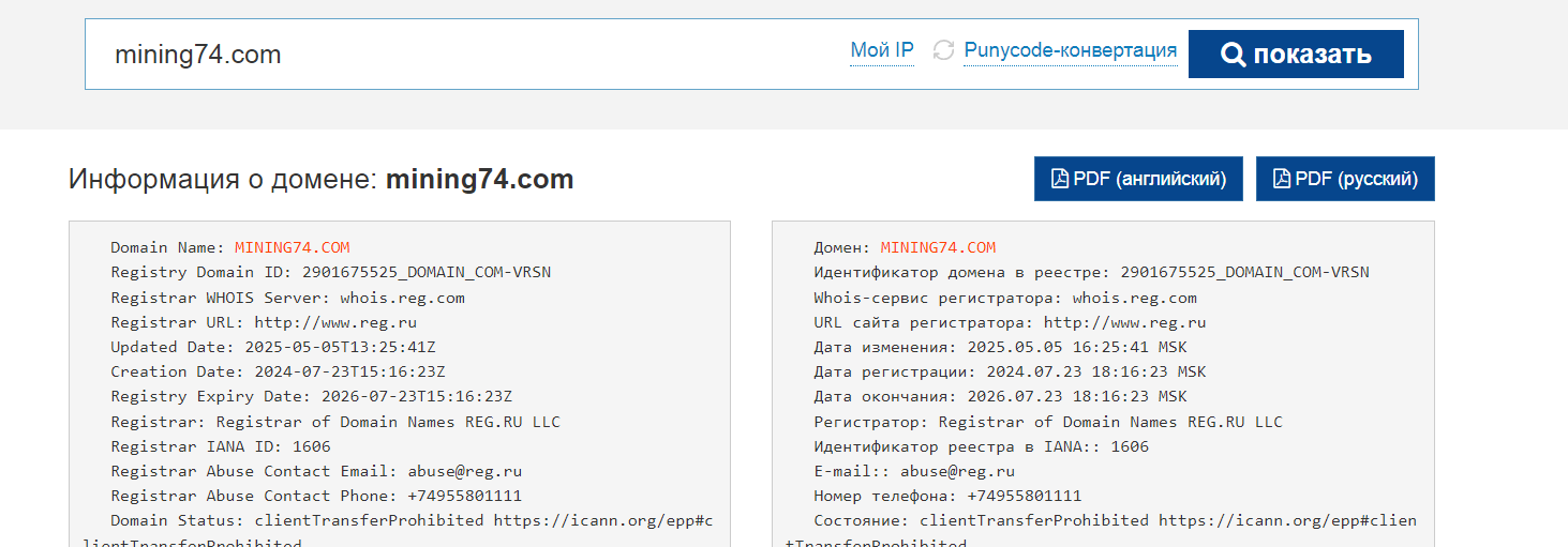 Рассматриваемая компания работает через площадку mining74 com, который предоставлен на русском языке.