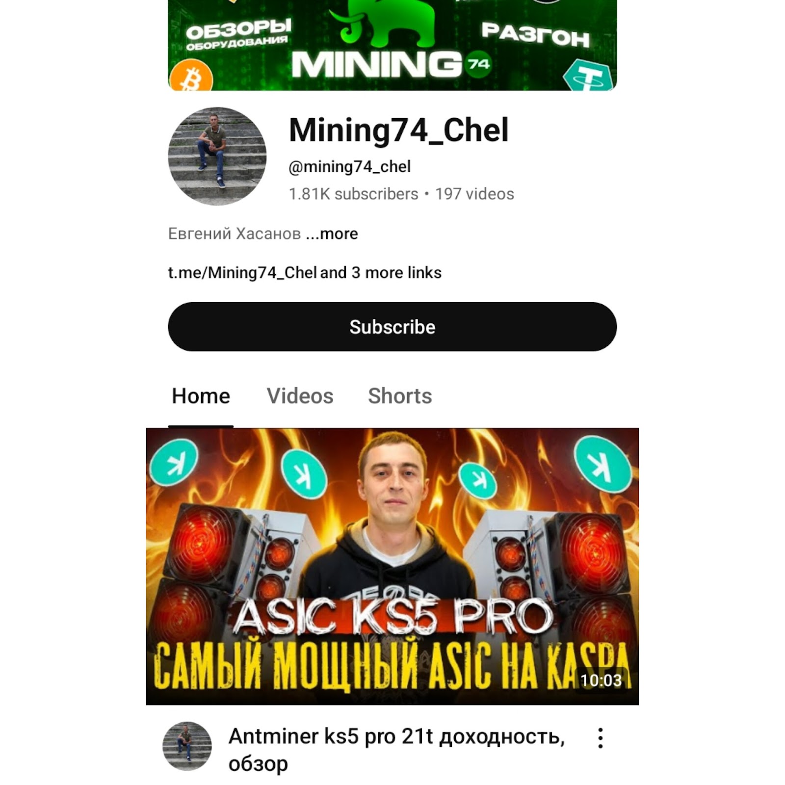 Размещено 197 видео, просмотры их составляют 400-5k. Видео посвящены обзору асиков, примеру доходности на майнинге.