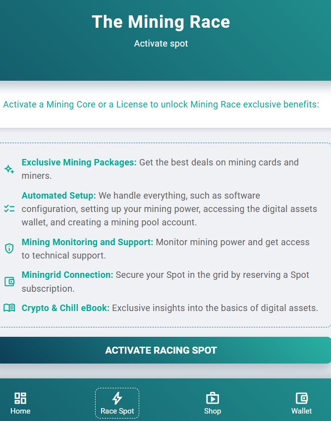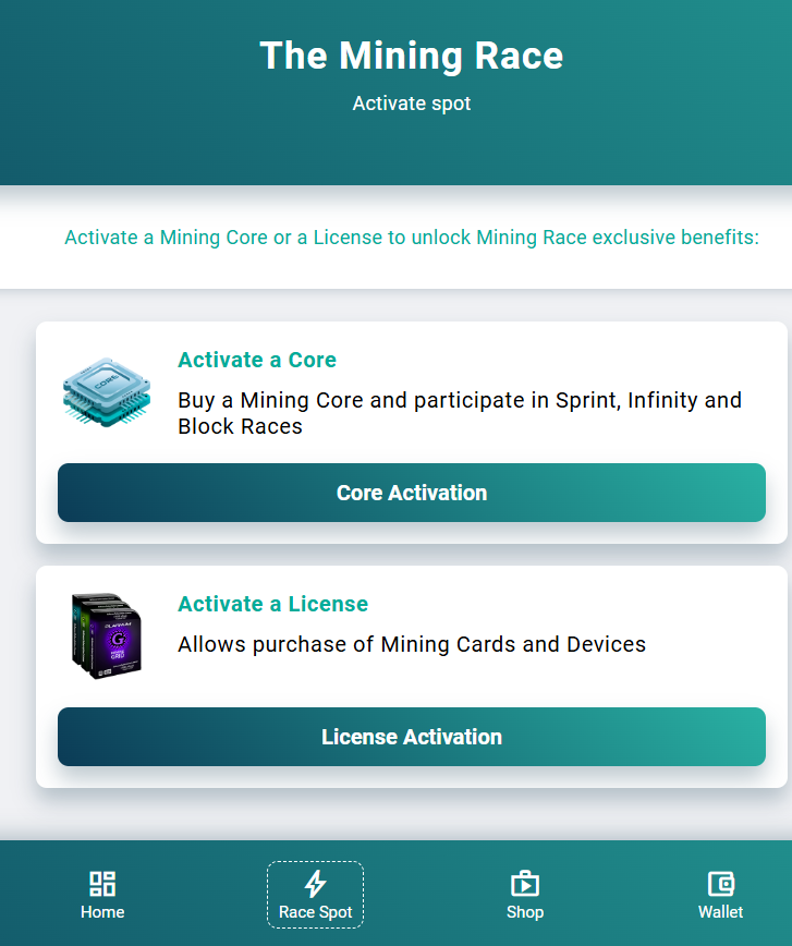 Далее следует перейти в раздел Race Spot. Тут будет предложено активировать Racing spot путем покупки лицензии по цене от 1000 долларов и ядра для майнинга от 35 долларов.