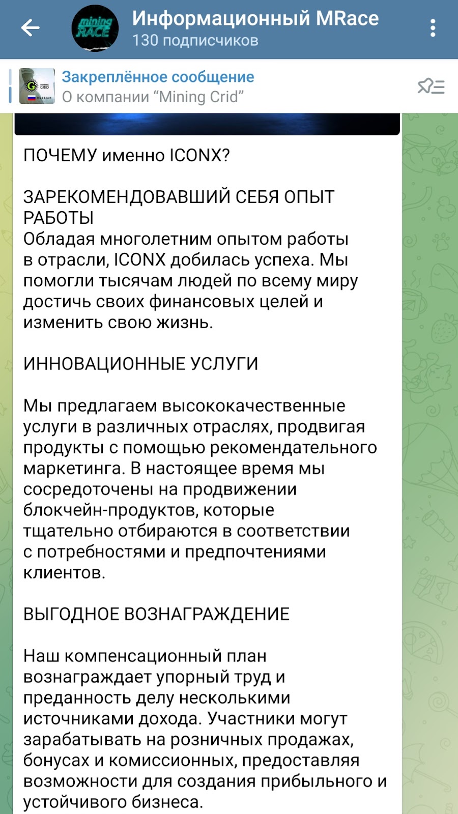 У проекта есть официальный телеграм-канал в соцсетях Информационный MRace. Он доступен по адресу @ mining race info. Ведется с 15 марта 2025 года. За месяц на канал подписалось всего 150 человек. В группе выкладываются посты о ценности биткоина, преимуществах выбора ICONX. Дается инструкция по началу заработка.
