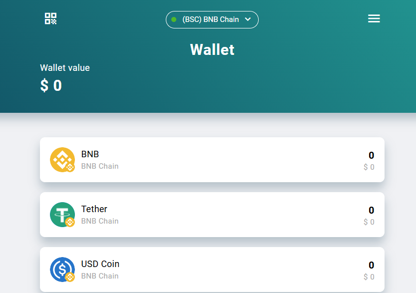 В разделе Wallet можно привязать криптовалютный кошелек. Это следует сделать в первую очередь, чтобы иметь возможность участия в проекте. Пополнить кошелек можно в BNB, USD Coin, Tether или другой криптовалюте. Для этого нужно выбрать токен и кликнуть на Receive. Будет сформирован QR-код для перевода денег.