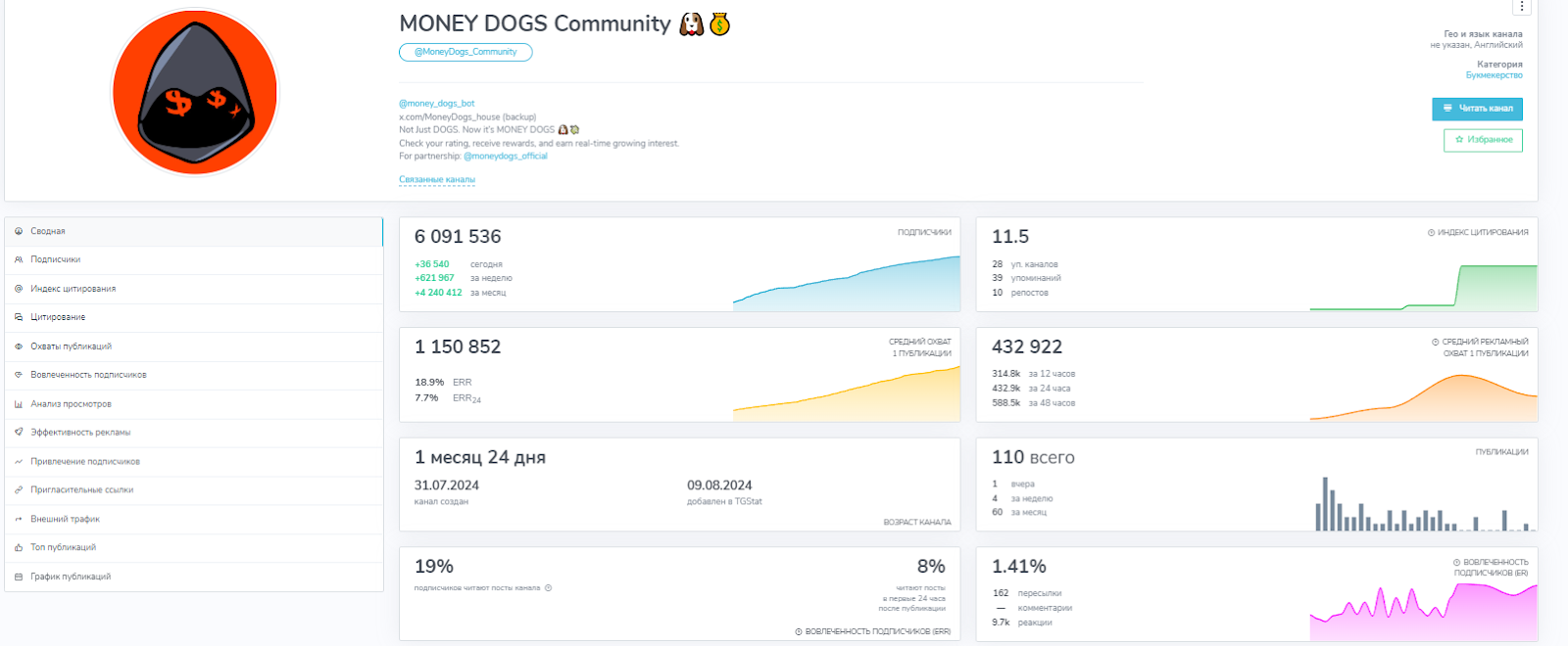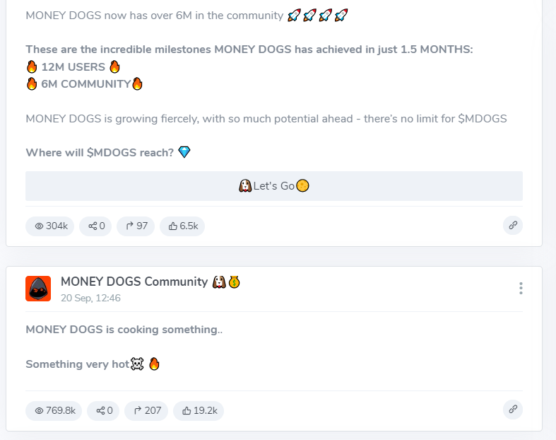 • Телеграмм канал MoneyDogs community был запущен около двух месяцев назад, сейчас на него подписано более 6 млн пользователей. Посты в MONEY DOGS Community читает не более 20% подписчиков, чата нет.