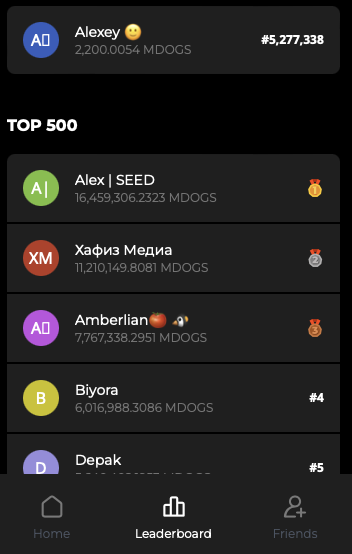Вкладка Лидерборд показывает ТОП игроков, которые заработали больше всех Money Dogs coin.