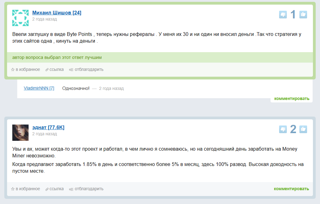 Отзывы о платформе Money Miner исключительно негативные. Пользователи утверждают, что с этим проектом просто невозможно заработать. Многие говорят об обширной реферальной программе, что может быть характерно для пирамид. Сообщается, что высокая доходность по инвестиционным программам сильно настораживает клиентов.