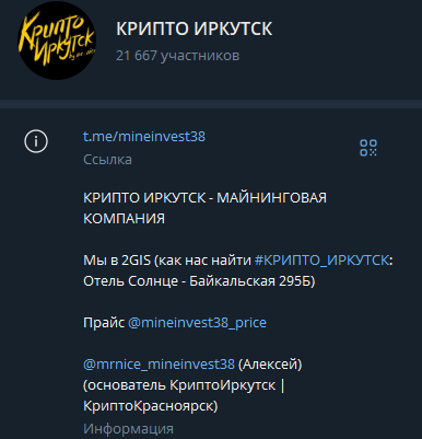 Основной канал компании Крипто Иркутск в Телеграмм — @mineinvest38. Это чат с большой активностью. За пару часов набирается по 30-40 сообщений.