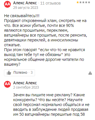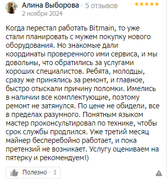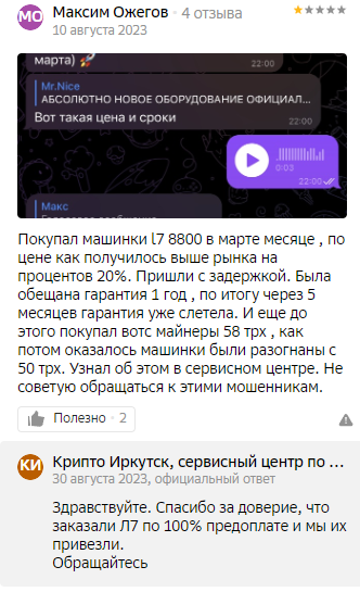 Две почти идентичные проблемы, отзывы публикуется с разницей в две недели. Смущает то, что написала Алина. «Мы с мужем стали планировать покупку нового оборудования» — типичный заход для проплаченного отзыва. Возможно, это не так, и у девушки семейный бизнес по майнингу, но это, как минимум, странно.