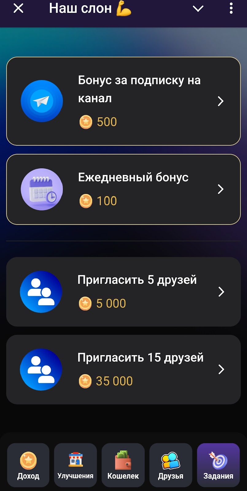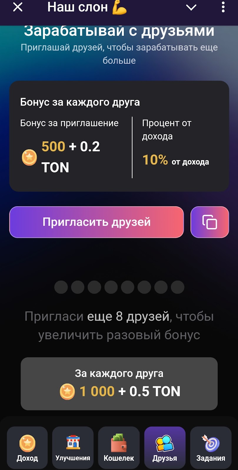 Раздел Друзья в мини приложении Наш Слон рассказывает об условиях реферальной программы. За каждого приведенного друга будет начислено 500 Слонкоинов и 0,2 Тон. Также игрок получает 10% от дохода подписчика. За некоторое количество друзей предусмотрены бонусы. Например, за 8 рефералов — 1000 монет и 0,5 TON.Задания в ТГ боте Наш Слон приглашают участвовать в реферальной программе с дополнительными бонусами, а заодно подписаться на канал проекта.