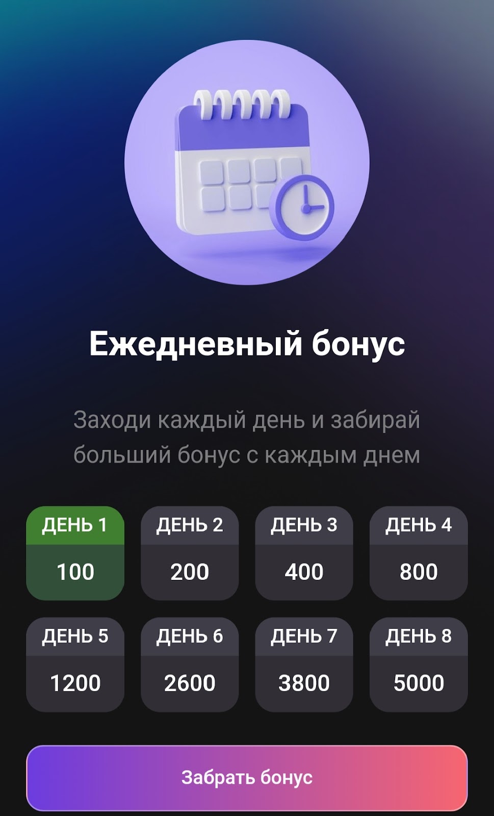 В этой же вкладке есть ежедневный бонус. В первый день игрок получает всего 100 монет, но награда будет прогрессивно растить до 8 дня, затем круг начнется заново.