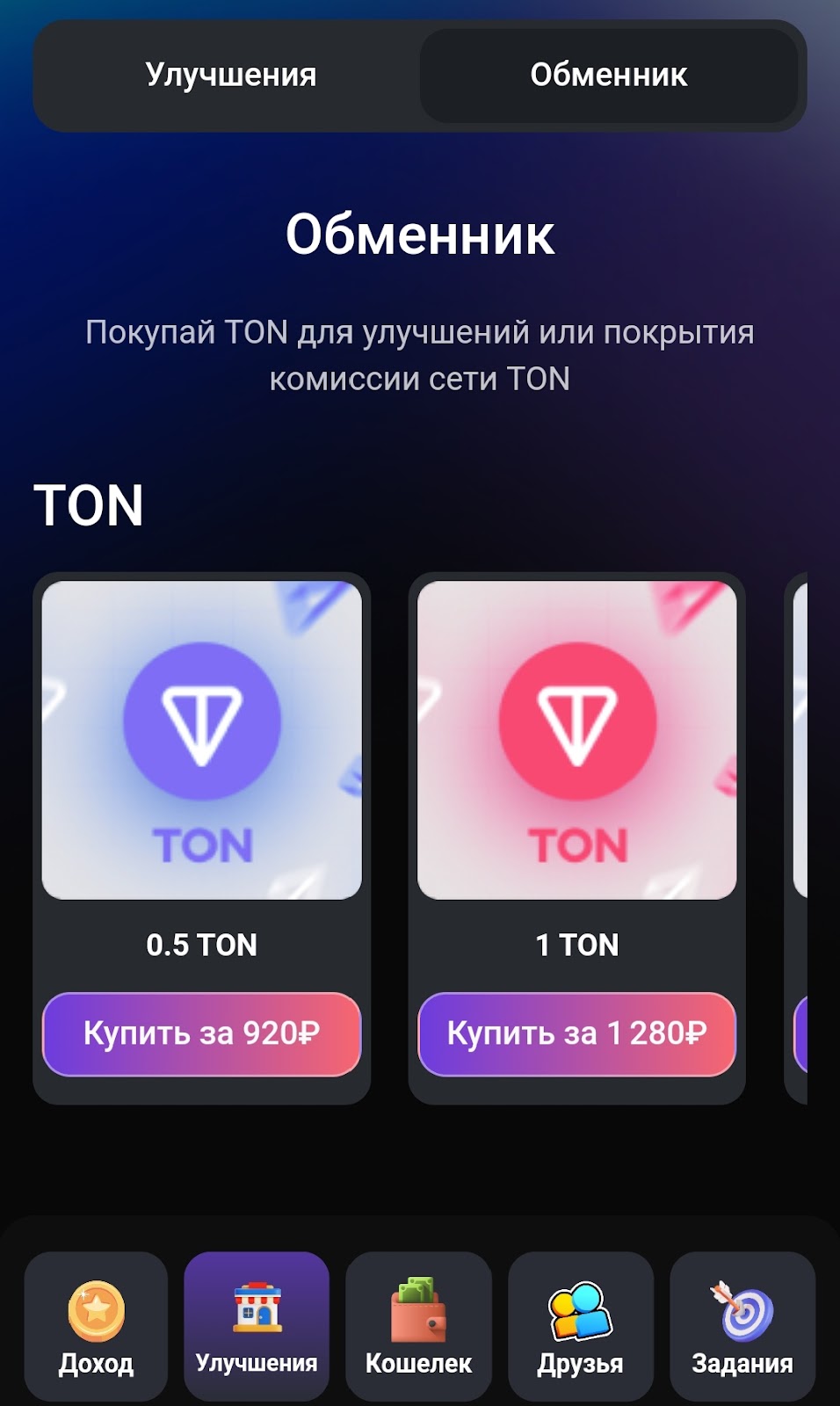 - автокликер — стоит всего 0,5 TON, собирает монеты автоматически.
