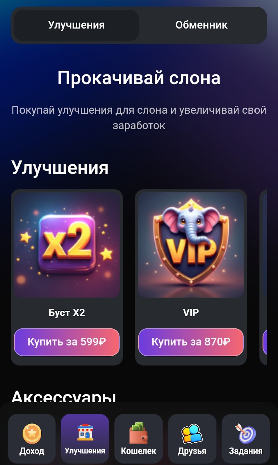 Другой вид улучшений проводится за Слонкоины. Игрок кликера Наш Слон приобретает аксессуары, питомцев для своего слоника. С каждой покупкой к стоимости тапа прибавляется 1, а к стоимости заработка — 7 копеек. То есть на первом уровне за клик пользователь получает 1 монету и 7 копеек, на втором уровне тапа — 2 монеты и 14 копеек и так далее.