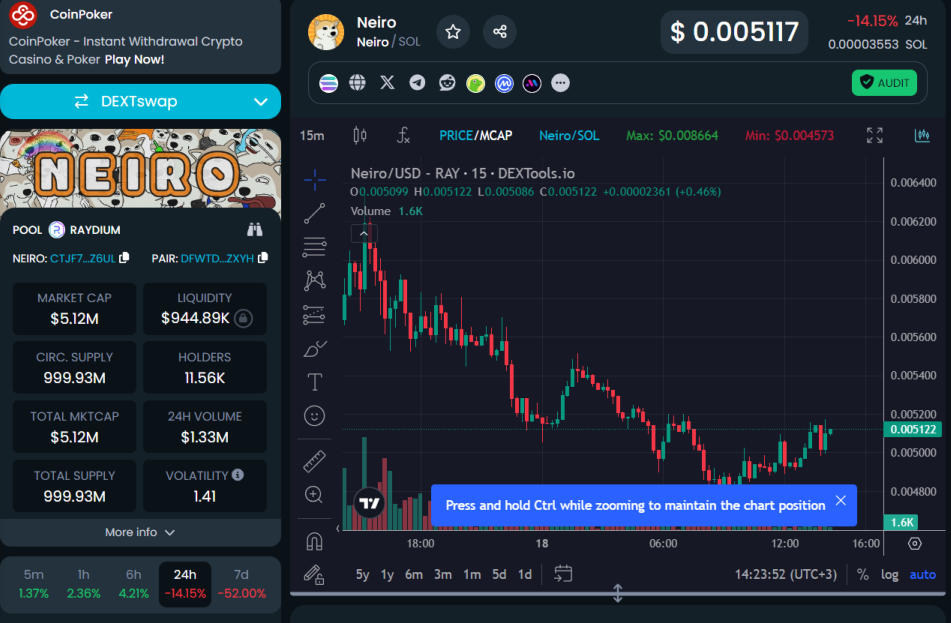 На официальном веб-ресурсе оставлена ссылка на Dextools. Здесь можно изучить график мемкоина Neiro Coin на блокчейне Solana. Исходя из выставленных данных: