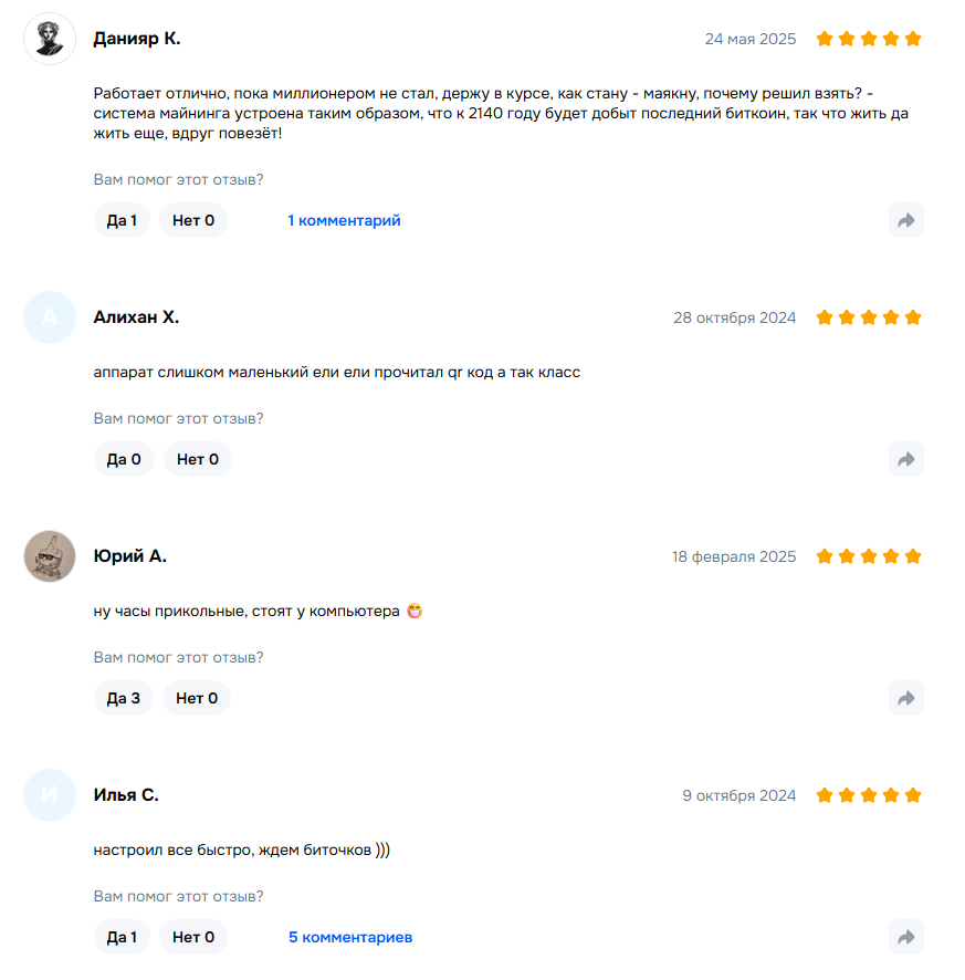 Если посмотреть комментарии и отзывы пользователей о данном майнере, то они в основном положительные. Только чаще всего в них указывают, что девайс был куплен в качестве подарка, что от него не ждут какой-то прибыли.