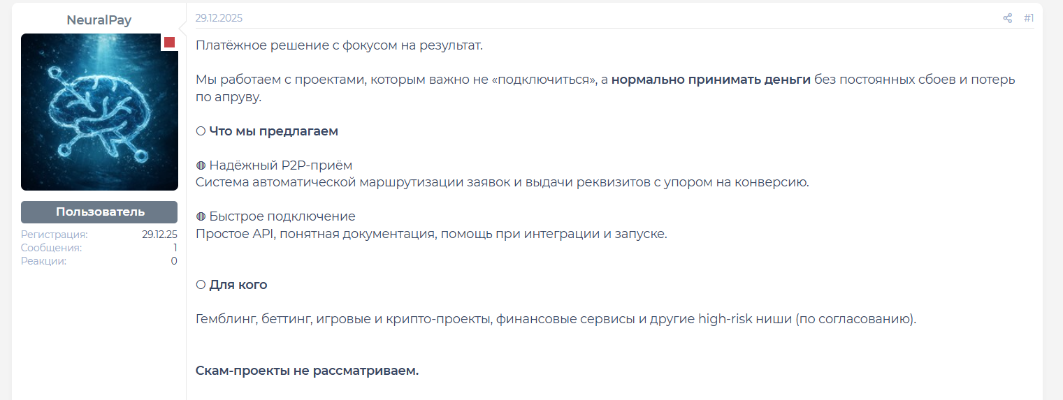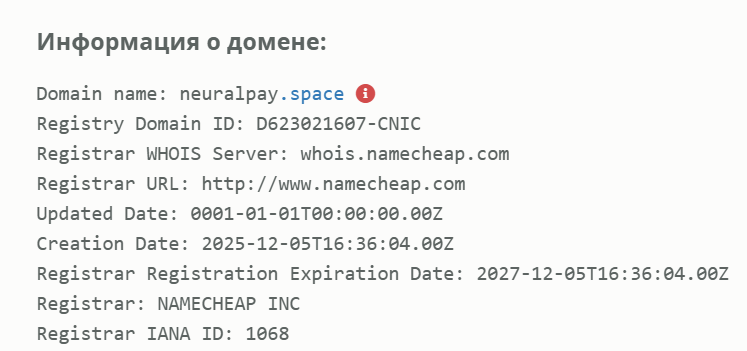Мы провели обзор и выяснили, что сайт проекта содержит только общие заявления без доказательств, вся коммуникация ведется через личные аккаунты в мессенджере, а домен был зарегистрирован в начале декабря 2025 года, поэтому проверить реальный опыт работы сервиса NeuralPay space пока невозможно. В результате: